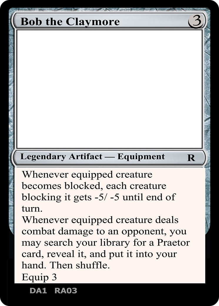 Whenever equipped creature deals combat damage to an opponent, you may search your library for a Praetor card, reveal it, and put it into your hand. Then shuffle.